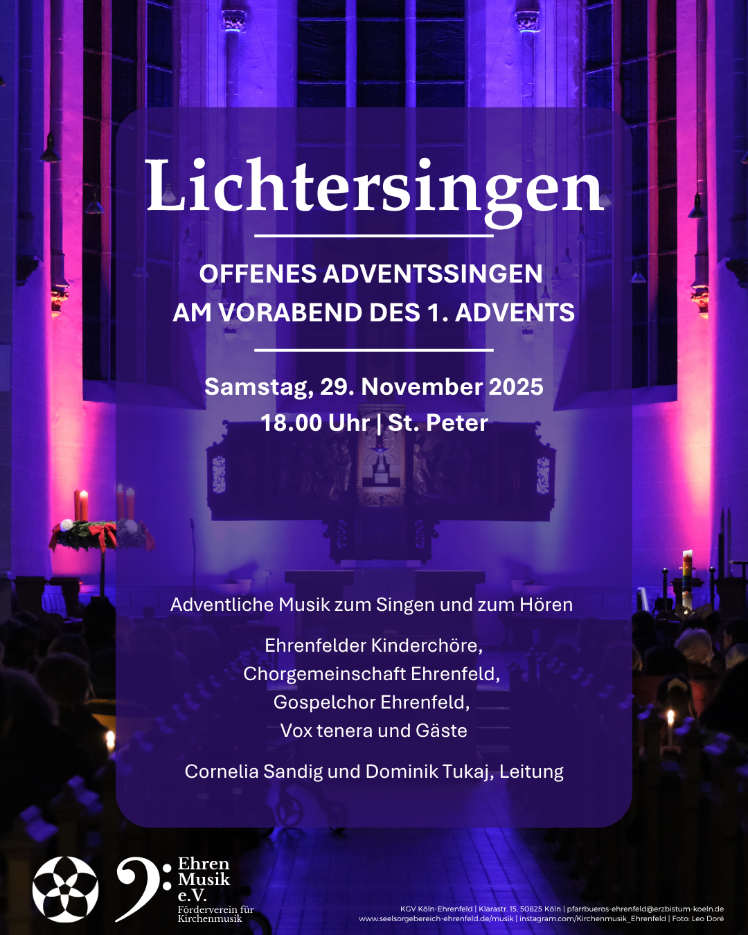 Eine Übersicht über die Kirchenmusik während der Advents- und Weihnachtszeit in der Pastoralen Einheit Ehrenfeld finden Sie hier:
